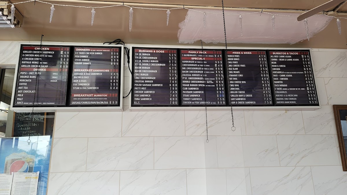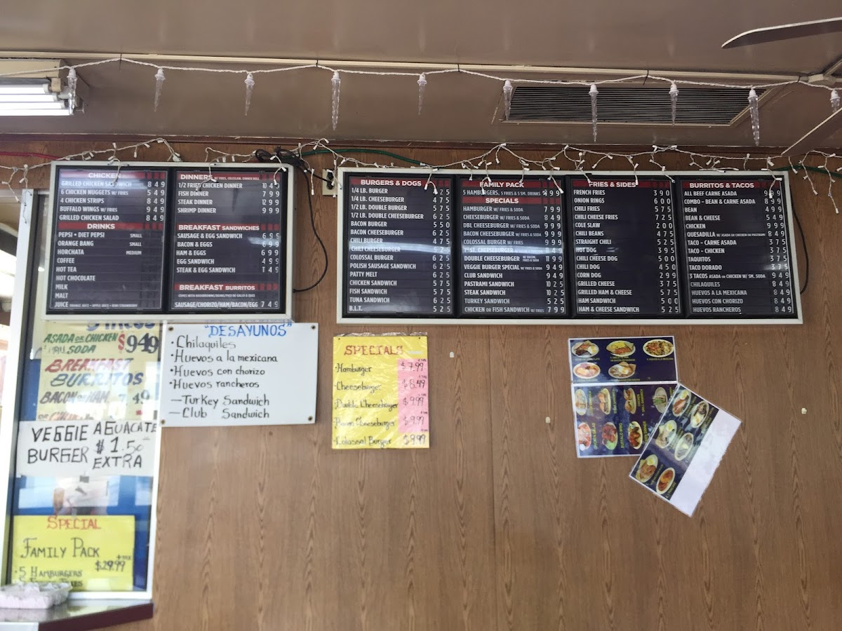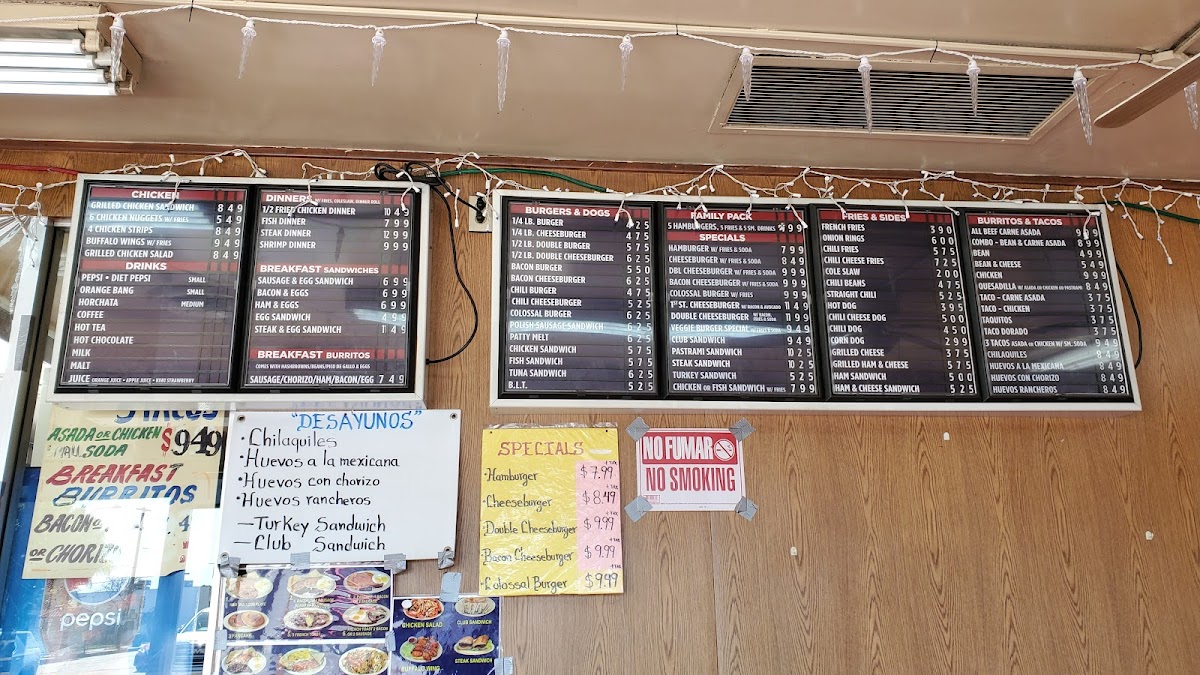The menu accommodates meals suited for breakfast, quick lunches, or casual dining, with a range of items designed for both traditional fast-food servings and Mexican-inspired breakfast and lunch dishes. Visitors typically use the menu to quickly select from familiar burger and sandwich options, alongside burrito and taco plates, complemented by classic beverage choices.
