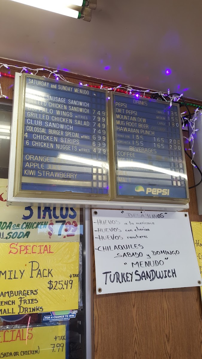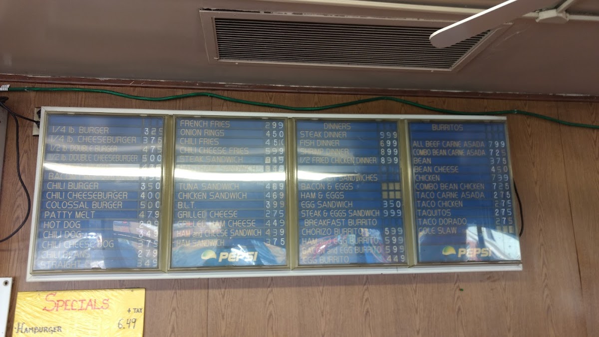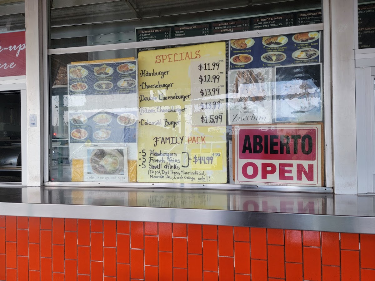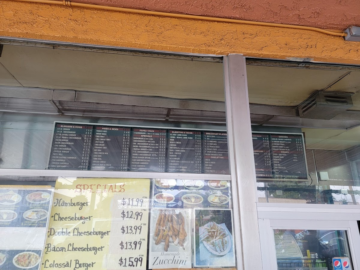 The menu accommodates meals suited for breakfast, quick lunches, or casual dining, with a range of items designed for both traditional fast-food servings and Mexican-inspired breakfast and lunch dishes. Visitors typically use the menu to quickly select from familiar burger and sandwich options, alongside burrito and taco plates, complemented by classic beverage choices.