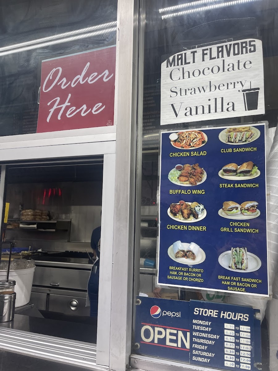 Beverages include hot and cold drink options such as coffee, hot tea, hot chocolate, and milk.